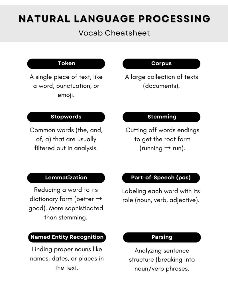 To help with my learning, I made a quick NLP vocab cheat sheet with some core terms. Figured I’d share in case it could help anyone else.